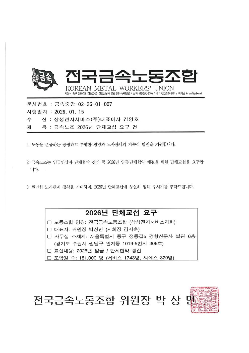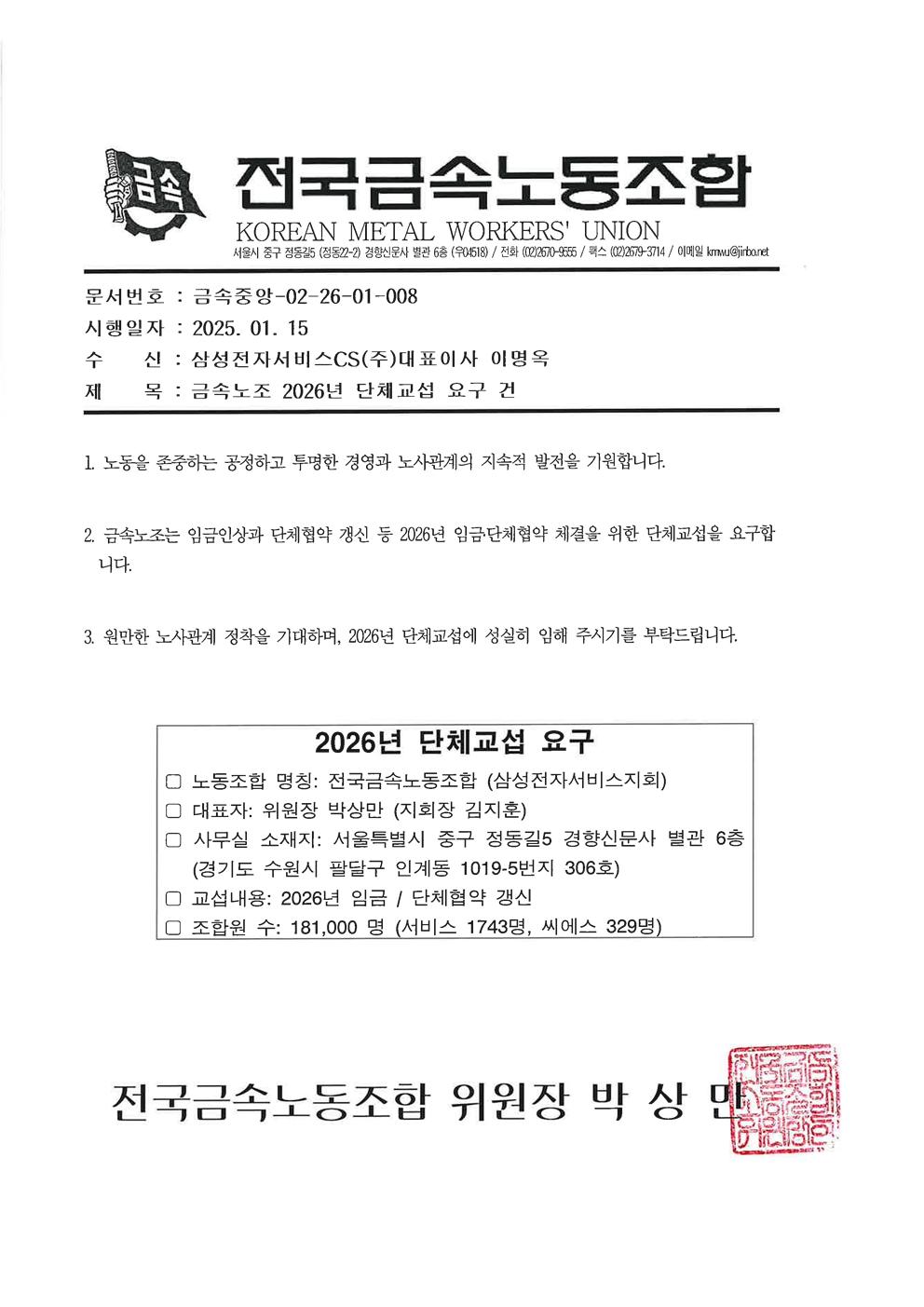 2026년 단체교섭 요구 발송
