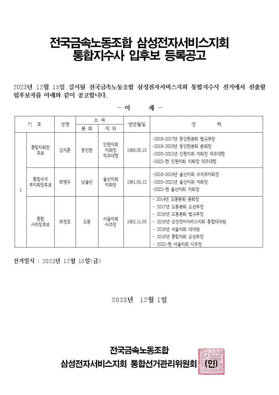 13기 삼성전자서비스지회 통합지수사 입후보 등록공고